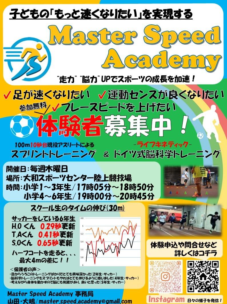 年長からサッカーを始める。小学校3年生までは足が遅く、練習でも試合でも活躍の機会はなし。小学校4年生のときにコーチの助言をきっかけに走る量も増え、少しずつ足が速くなり、中学校1年生では走れるサイドバックとして試合に出場する機会が増える。足の速さを取り柄に、サッカーのスキルをカバーし活躍する経験を得る。 その後、怪我をきっかけに陸上競技に転向。高校、大学で専門的な走る技術を学びながら学生指導者兼アスリートとして活動。大学3年時には100mを10秒57で走る記録を達成。現在は実業団選手兼指導者として活動中。 自らの経験と専門的に学んだ知識から、「走りは技術」であり、正しい技術を学ぶことで誰でも速く走れると確信。 小学生の早い段階から走る技術を学んでいたらもっと試合に出られていたという思いや、足の速さで活躍の可能性が広がった経験から、大嶋さんとの出会いを機に、小学生に速く走れることの喜びを感じ、活躍の機会を広げてほしいとの思いを強くし、Master Speed Academyの設立を決意。 |